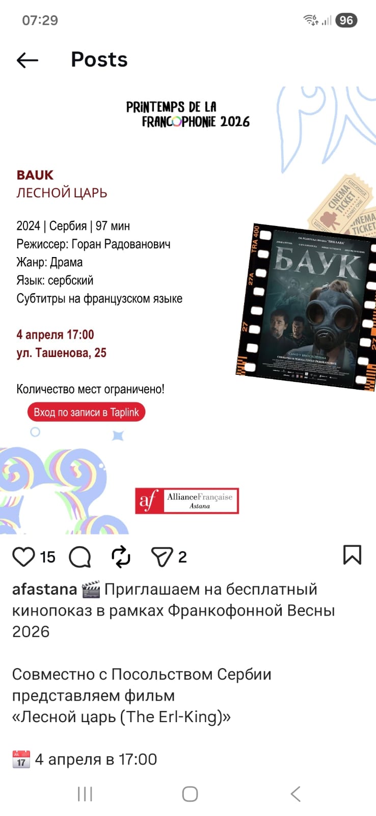 Амбасада Републике Србије заједно са амбасадама Јерменије, Краљевине Белгије, Канаде, Француске, Литваније, Краљевине Мароко, Румуније и Швајцарске учествује у пролећу Франкфоније које се од 1. до 15. априла 2026. одржава у Казахстану.